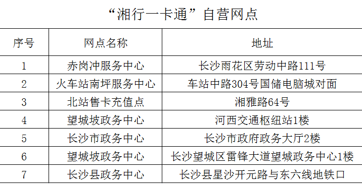 公交自营网点:赤岗冲公交IC卡中心、望城坡公交IC卡中心;