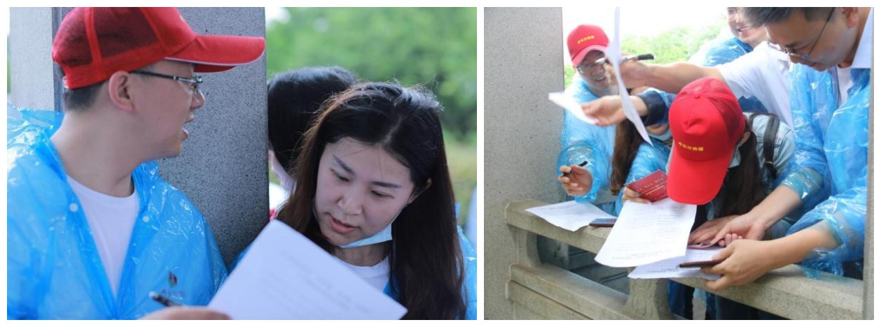 下午两点,全体人员统一乘坐地铁来到橘洲游客中心,整个健步走全程5公里,每四人一组,大家自由组队,每队到四个指定答题点进行党史学习教育题目作答,最终决出三支优胜队伍。出发之前,大家还用签字笔在红色扇面上一笔一划写下了“不忘初心、牢记使命”“红心向党”等对党的宣言。