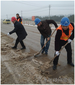 27日凌晨长沙地区突降暴雪,南横线浏阳工地应急小组于早上6点迅速反应。全体成员对南横线普迹至跳马项目现场进行巡查,开展抗击冰雪工作,共检查清理平交路口24处,撒盐2吨,铺设麻袋40个,在安全隐患路口处设置交通警示标志2套,并安排3班人员24小时值班巡查。南北横线常务副总经理陶然同志强调浏阳工地要时刻加强现场巡查、充分储备物资,确保能够及时调拨物资、保障施工段道路行车安全并对事故迅速响应。