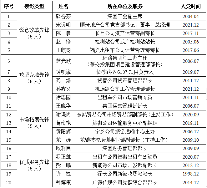 为庆祝中国共产党成立104周年,充分发挥先进典型示范引领作用,激励全体党员干部职工坚定信念、奋勇争先,努力开创工作新局面,集团党委决定表彰一批“党员先锋”。经各级党组织推荐和考察,产生了锐意改革先锋5名、攻坚克难先锋5名、市场拓展先锋5名、优质服务先锋5名拟表彰对象,现将拟表彰对象进行公示。